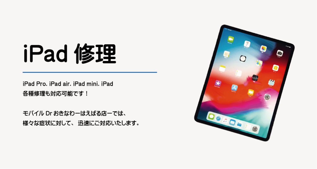 - iPadは時代の流れとともに画面の大型化、そして本体フレームの薄型化しております。その為、本体が重く薄くなり、落下させてしまうと画面ガラスが割れてしまったり、液晶が破損して表示に不具合が発生したり、タッチパネルが反応しない、誤作動が発生するなどの症状で修理をご依頼いただくことが多くなっておりますが、弊社にて症状を確認し丁寧に修理、できる限り即日お渡しできるようご対応いたします。
